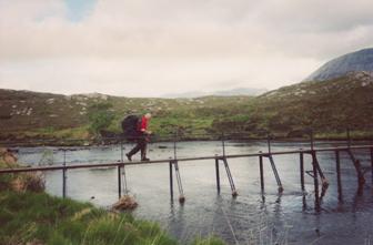At a point on the A837 near Ardvreck castle, take the drove road on the right leading under the W flank of Glas Bheinn which eventually comes out again on the A837 at Loch na Gainmhich. The road is followed to Unapool and over the Kylesku Bridge to Kylestrome. On the A837 just N of Kylestrome take a road on the right leading E towards Achfarry and various camping possibilities.